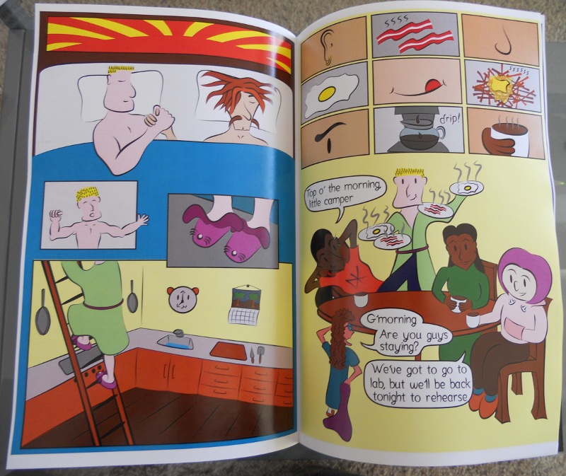 Chapter 1 of Electric Puppet Theatre is no longer available in print. Here are some images of the print-on-demand copy from Kablam in case you are thinking of using them for your own comics. The comic was digitally printed from 300 DPI RGB TIFFs generated from the original vector art. The printed colors looked a little bit dithered compared to a comic printed with true four-color separation, but were otherwise lovely. See for yourself!